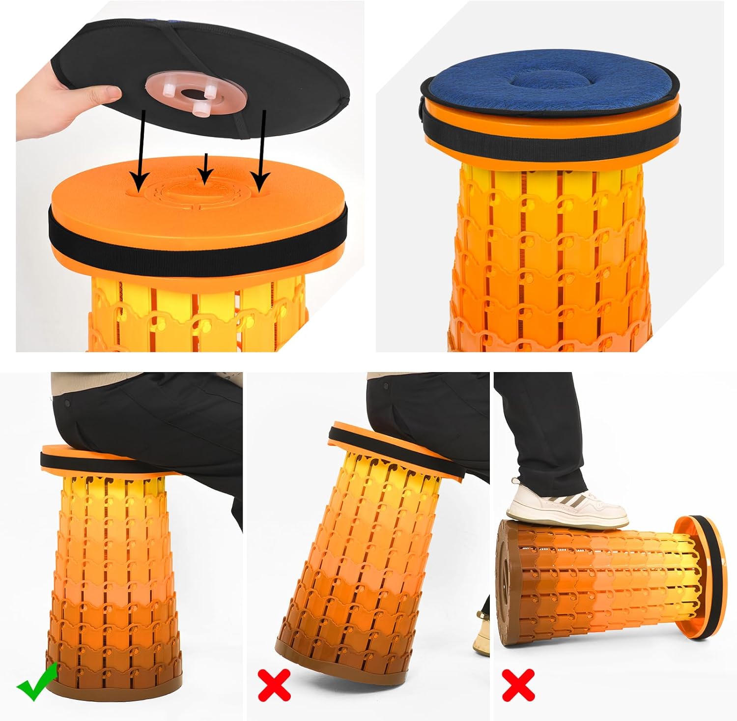 Description:Our collapsible stool folding adopt fish scale design and upgraded material allows for a sturdier base with a maximum load of 1000lbsFolding stool height can be adjusted freely between approximately 2.7 inch and 19.6 inch.anyone can adjust it as high as they wantThis portable collapsible stool is only 2.54 pounds and can be folded into 2.7*9.8 inch,it can be easily packed into a backpack or suitcaseFolding stool for party is perfect for everyday use, you can use it when you're camping, fishing, hunting, hiking, barbecuing, picnicking, queuing, gardening, etcSpecifications:Material: 100% PolypropyleneColor: OrangeMaximum Height: 19.6 inchesBase Diameter:9.8inchUses: Camping, Fishing, Hunting, Hiking, Barbecuing, PicnickingPackage includes2 x Folding StoolTips1. Adjust to the maximum height: Grasp the holes on both sides of the stool with your fingers, pull to the maximum height, and then turn clockwise to fix.2. Adjust the height: Pull it to the height you want, then rotate it clockwise to secure it.3. Retract: Pull slightly to unlock the stool, then turn counterclockwise.4. You may need to try it a few times to master its operation.