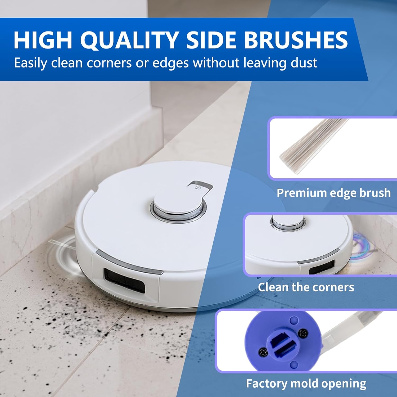 • 【Premium Material】:Main brushes are made of premium materials which can protect floor no damage when cleaning , Large capacity dust bag design, easy to collect hair and pet hair that falls on the ground, its snugly, preventing leaks, 6 pcs mop pads have high water absorbency to help easy removes kinds of stains, footprints and dust, This set also comes with 6 side brushes, which can enter hidden areas to remove dust and debris.
