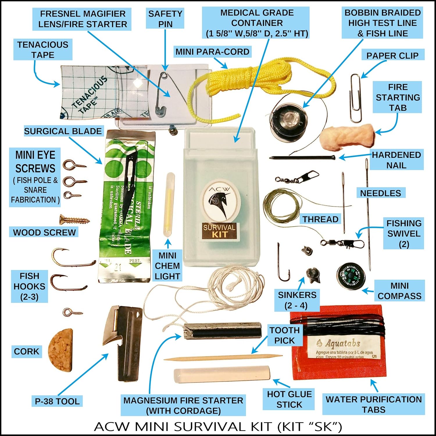 ACW tactical Survival essentials mini kits: Tic Tac sized preparedness kits. Compact for adding to larger kits, packs, vehicles, home, office or right in you pocket. See pictures for contents or our home store for details. Adventure gear, Survival, Every Day Carry (EDC), Utility, and outdoors. Product of America, by ACW tactical, your preparedness & Happy support provider Specs: Weight: 1 to 2 oz. Size: 2.5" tall x 1.65" wide x .75" deep.