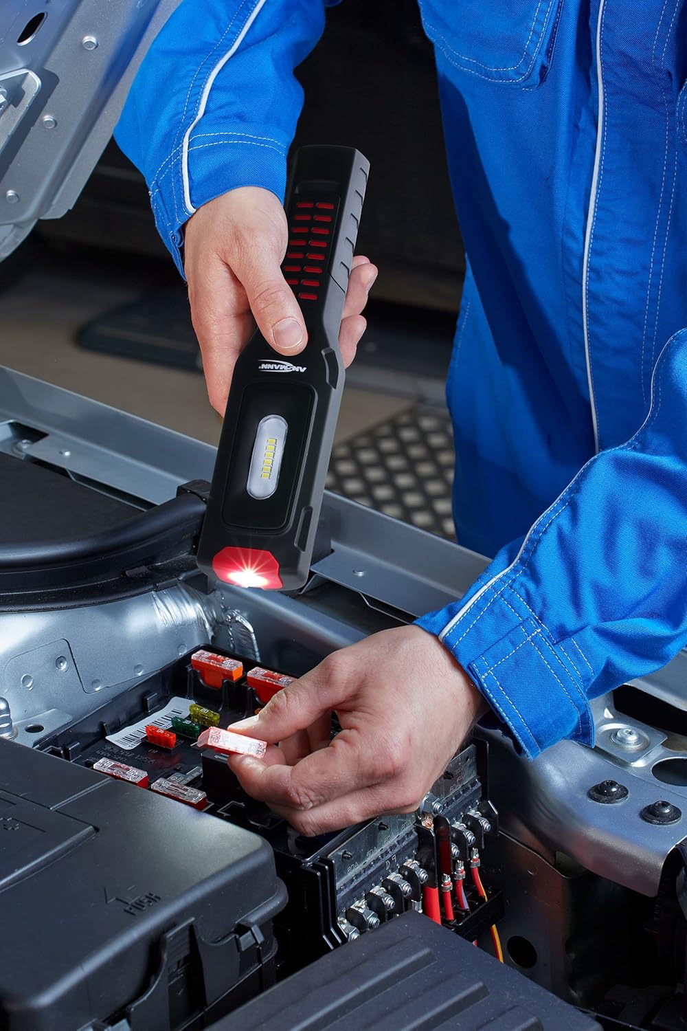Your project, your passion, your light ANSMANN stands for quality and reliability! We have the aim to develop high quality products for professionals. The IL300R is a professional work light in an exclusive ANSMANN design. This handy and reliable lamp is perfect for demanding work and for use with lifting platforms, inspection areas, workshops or industry. High efficiency brightness Because of the use of the latest SMD-LED technology the lamp offers an intensive white light. The bright main light has a brightness of 555 Lux and 325 Lumen, at a distance up to 1 meter to the working area. Thanks to the wider radiation angle the bright light is spaced out evenly, so small details and big surfaces are illuminated uniformly. An additional spotlight at the lamp head offers a powerful precision light so you won’t miss a detail. The temperature of the LEDs is at ca. 6500K, which does not weigh heavy on the eyes. This means a pleasant natural white light that does not make you tired and offers a relaxed working atmosphere. Ergonomic design concept The robust housing is formed ergonomically. The rubberized surface offers the right grip for demanding work. With many practical functions, the IL300R is a really multi-talented tool and ideal for multiple uses. It contains a 180° rotatable lamp handle adjustable in 8 steps for flexible lighting alignment. Two foldable and 360° rotatable hooks at the back of the housing offering additional fixing opportunities. With three magnets, the lamp can be fixed to metallic surfaces. So you can use both hands to operate in workshops, buildings or assembly areas.