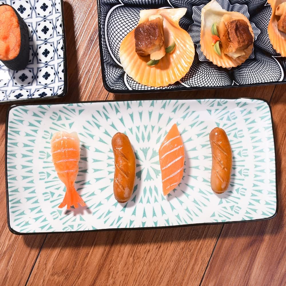 Ceramic Rectangular Plate Set, 4 Pack 9.7x4.3 Inch Sushi Plates, Microwave Dishwasher Safe Geometric Pattern for Appetizer Dessert Daily Use