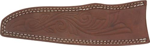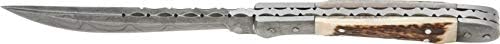 9" Overall. 4 1/2" Damascus steel blade. Full tang with filework. Stag handles with Damascus steel bolsters. Leather belt sheath.