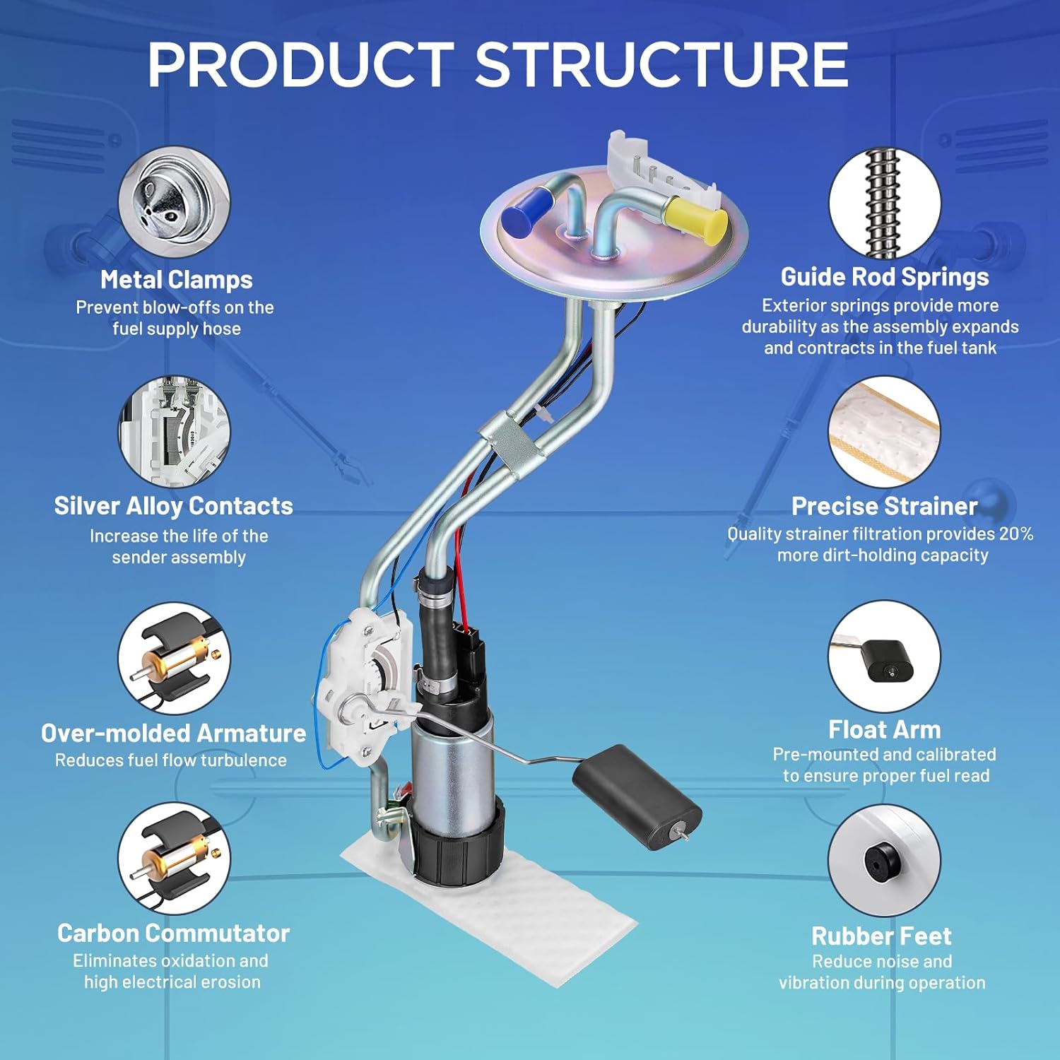 • [ OE Standard ] - Our Automotive Electric Fuel Pump Assembly are designed to meet or exceed OE specifications in quality, fit and function. Made with all new materials under rigorous quality controlled manufacturing and testing procedures to ensure quiet operation, unmatched performance, and long-lasting durability.