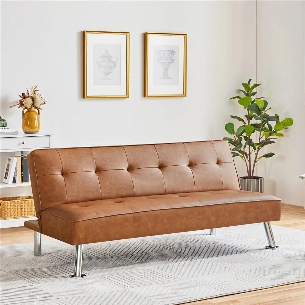 Functional and aesthetic furniture for limited space.Crafted from a plywood frame, faux leather covering, foam fill, and strong metal spring, this adult convertible futon bed features a flexible folding contraption to lock the back at 2 tilt angles for reading and lounging or lay it down as a comfy platform bed.With the solid construction.The tufted faux leather upholstery presents an understated yet touch.And the classic coloring and sleek design can blend with any of home decor.Dimensions:Sofa back tilts at 105°: 65.6'' L x 31.5'' W x 30''HSofa back tilts at 140°: 65.6''L x 35.5'' W x 23.6'' HSofa back tilts at 180°: 65.6''L x 37''W x 15.7'' HSeat height: 15.7''Seat size: 65.6'' L x 20'' WSofa back size: 65.6''L x 17''WMaximum weight capacity:772lbG.W.: 61.5lb3 Convertible positionsWise choice for limited spaceResidential UseIndoor Futon SofaSet Includes1*folding bed (no other presentation items included).Warm tips:1. Due to manual measurement, please allow 2-3% error, before you bid, please make sure you don't mind.2. The color may vary due to different displays, please refer to the actual product.The folding bed comes with four universal wheels for easy mobility. The wheels are smooth and noiseless.