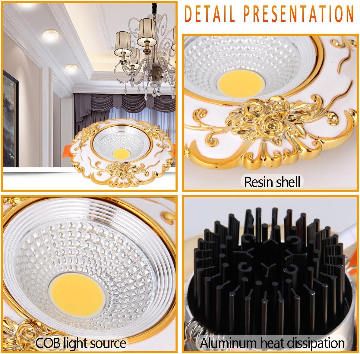 Product informationPacking list:5 x LED downlightParameters:Material: resin + aluminumLight source: COBColor: white + goldPower: 3W, 5W, 7W, 10WVoltage: 80-240(V)Installation: embeddedLight color: three-color temperature dimming (white light/warm light/neutral light)Dimming method: ordinary wall switch control (one on and one off cycle to change the light color)Cutting size: 60-90mmColor rendering index: Ra≥80+Application: corridor/bathroom/corridor/garage/office/stairs/home/furniture/commercial photos/wine cabinet/display cabinet, etc.