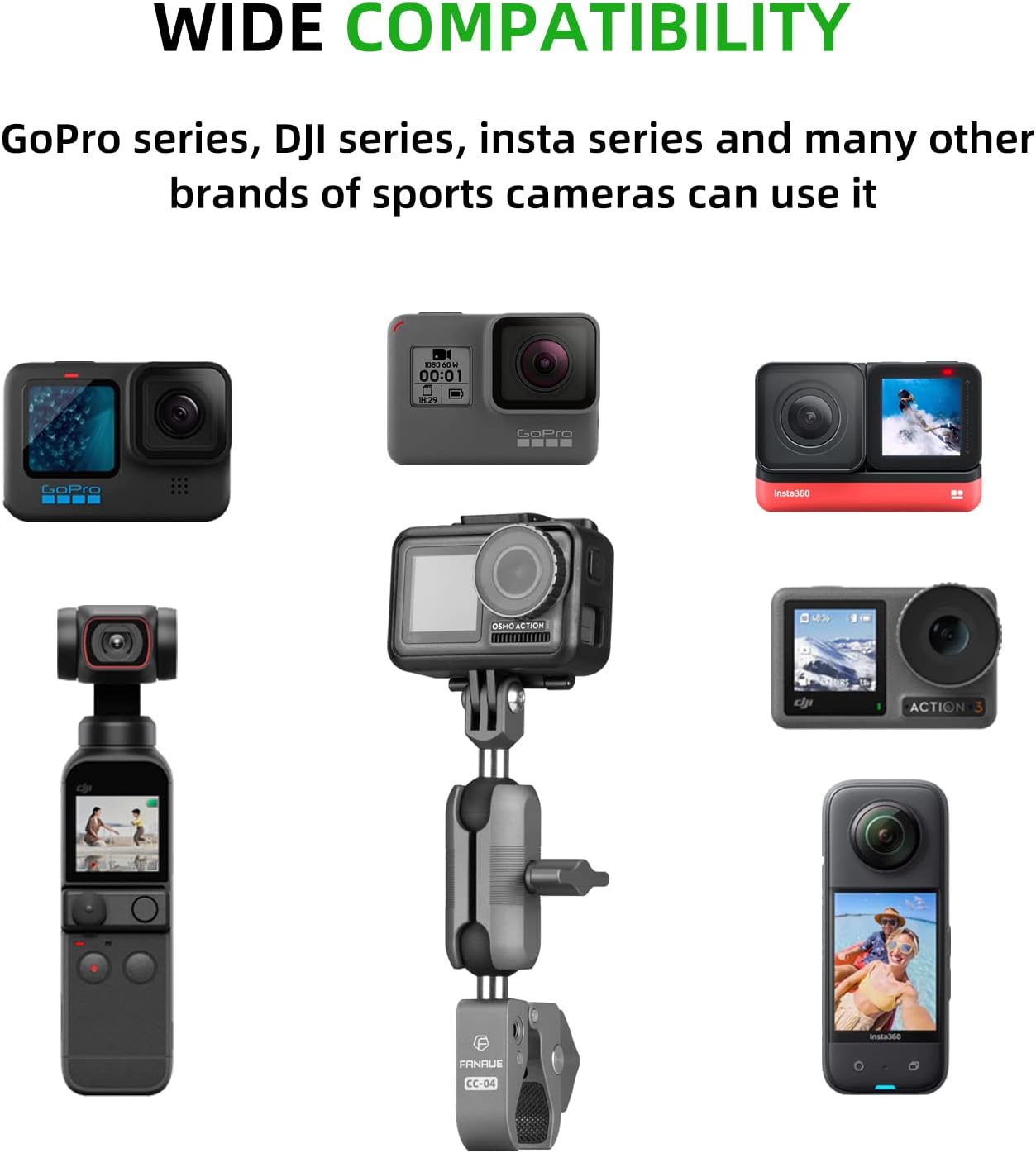 This set includes CC-04 Strong rod clamp、DA-60 Aluminum Alloy Double Socket Arm and GB-01 Action Camera Mount Interface.You can use them in various suitable situations , all parts are made of aluminum alloy , stainless steel and rubber , hard anodized , can be used in harsh environments , more stable and strong . CC-04 Strong rod clamps / clamped There are four 1/4-20 screw holes on the base , you can add or match more accessories , realize multiple functions of one base , and accomplish more tasks with fewer devices . Set includes:CC-04*1 DA-60*1 GB-01*1