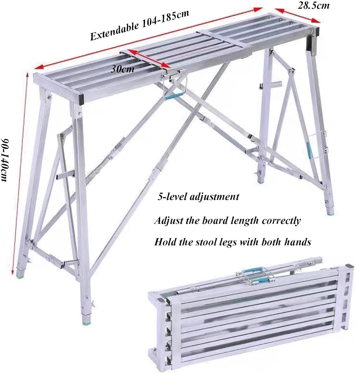 Adjustable Scaffolding Platform – Portable, Foldable & Durable Workspace SolutionElevate your construction and repair projects with the Adjustable Scaffolding Platform, the ultimate all-in-one equipment set designed for versatility, mobility, and safety. Crafted from lightweight yet heavy-duty metal frames, this scaffolding platform combines foldable convenience with adjustable height settings, making it ideal for generic de construccion tasks, indoor renovations, or outdoor repairs.Wide Range of Applications: The adjustable work platform is widely used in various industries and projects. From construction sites to home renovations, which can be used for wall painting, window cleaning, unload, home decorating, etc., it provides a trusted and safe platform for workers to perform their tasks effectively.Make your father or husband happier with a special gift! Give them some sturdy and practical tools to make their work easier and more enjoyable.【Important Safety Instructions】1. When using the portable scaffolding, please pay attention to safety. The legs of the bench shuould be placed firmly on the ground with both legs straight open to stabilize it. 2. Staircase Use: When using on stairs, place two legs on the ground and the other two securely on steps. Stair height differences may prevent full platform coverage—ensure stability before use to avoid tipping or slipping. 3. Handling & Maintenance: Made of welded iron, this scaffolding may have sharp points—wear gloves during setup. Always secure the platform before climbing, use caution, and inspect regularly to ensure safe operation.