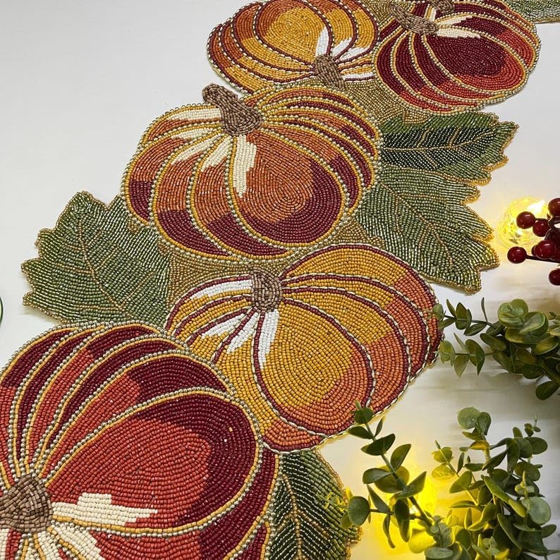 This beautiful multicolor pumpkin and floral design beaded runner is made using beads. This looks stunning on any table. These are handmade products and are done with a lot of precision. We use the best beads to create the design. This runner looks great on the center table or dining table. While creating this runner, we take extra care to tie all the knots and secure them properly. These are ideal for the living room and dining room. This will add glamour, texture, and interest to your table.
