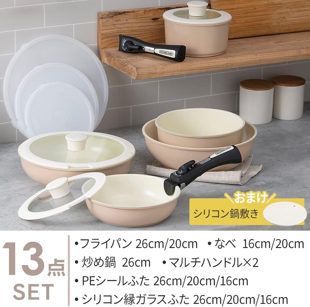 Far infrared rays for quick and delicious results. This 13-piece set includes 2 multi-handles, a frying pan, a pot, a glass lid, and a PE seal lid. Heats up to the core with far infrared effect! The effect of far infrared radiation emitted from ceramic cording is heated to the core of the ingredients, giving it a fluffy and soft finish. High thermal conductivity for speed cooking. New ceramic coating for a more durable cooking surface. The abrasion resistance test on the cooking surface has passed 700,000 times. It is also non-stick and easy to clean. Aluminum die-cast sole with thick design that prevents deformation caused by heat. The handle can be removed so you can go to the table as is. Convenient for storage. IH 200 V, 100 V, can be used on gas fires and ovens. Product Contents: Set Contents: Frying pan: 10.2 x 1, 7.9 x 1 Fried pot: 10.2 inches (26 cm) x 1 Pot: 7.9 inches (20 cm) x 1, 6.3 inches (16 cm) x 1. Silicone Rimmed Glass Lid: 10.2 x 0.4 x 0.6 inches (26 x 1, 20 x 1, 16 x 1 PE Seal Lid: 10.2 x 0.4 x 0.6 inches (26 x 1, 20 x 1, 16 x 1 cm) Multi-handle x 2 Compatible heat source IH200V, IH100V, Gas Stove, Oven, Radiant Heater and Other Electric Heaters Material (frying pan, pot) Body: Aluminum alloy (bottom thickness: 0.2 inches (4.3 mm) Base of buckle: Stainless steel (16% chromium) (thickness 0.5 mm) Surface treatment (interior/exterior): ceramic coating Frying pan: 10.2 inches (26 cm) / 7.9 Product Size (Approx.): Diameter 10.2 / 7.9 inches (26 / 20 Full Capacity: 0.7 gal (2.8 L) / 0.4 gal (1.4 L) Fried saucepan, 10.2 inches (26 cm) Product Size (Approx.): Diameter 10.2 inches (26 cm). Full Capacity: 1.8 gal (3.4 L) Pot 7.9 inches (20 cm) / 6.3 inches (16 cm). Product Size (Approx.): Diameter 7.9 / 6.3 inches (20 / 16 cm). Full Capacity: 0.7 gal (2.7 L) / 0.5 gal (1.5 L) Multi-handle Materials: Resin upper: Nylon with glass (50%) (heat-resistant temperature: 356°F (180°C). Resin bottom: Phenolic resin; (heat-resistant temperature: 330°F (150°C). Metal: Stainless Steel Rubber part: Silicone resin (heat-resistant temperature of 488°F (220°C). Silicone rim glass lid. Material: Tempered glass, silicone (heat-resistant temperature of 488°F (220°C). PE seal lid Material: Polyethylene (heat-resistant temperature: 176°F (80°C). Silicone pot bed. Product Size (Approx.): Diameter 6.7 inches (17 cm), Thickness 0.2 inches (6 Material: Silicone resin (heat-resistant temperature: 488°F (220°C). Ceramic color pan: Please be sure to use under medium heat. Please be sure to apply oil before using. Avoid sudden cooling. Cannot be used in microwaves.