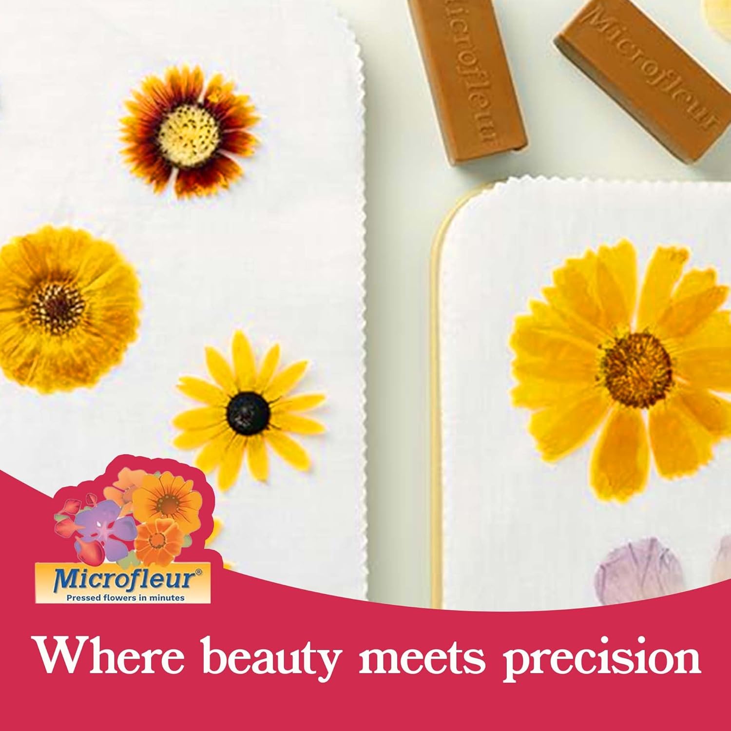 The Microfleur Max Microwave Flower Press comes with all you need to press flowers. Having an extra refill is great for just having a spare on hand. It never hurts to have a spare refill, as they get hot with repeated use, so you can switch refills and keep pressing while the other one cools. Switching out refills also lets you press thicker flowers that may require resting between bursts in the microwave. So while one rests, you can use the other to keep pressing. The Microfleur Microwave Flower Press presses flowers. Fast. Leaving you with beautiful, bold colors, and unlimited creative possibilities. The Max 9" (23 cm) Microfleur microwave flower press is Microfleur's most wanted press with 81 square inches of pressing space. Flowers, foliage and plants are quickly pressed between two cotton liners, two thick wool pads and two vented platens, all of which are held together by 4 clips. Pressing is done in very short intervals spaced with short resting periods. Flowers can be used the same day and color retention is exceptional, compared with traditional pressing methods. The pressed flowers can then be used for greeting cards, scrapbooking, wedding and other invitations, menus, bookmarks or applied to candles and soap, art and decoupage projects. It is the ultimate flower press and is commonly used by oshibana and other artists, as well as by botanists. Microfleur presses are not recommended for children under 12, without adult supervision. The 9" (23 cm) Max refill pack consists of two wool pads and two cotton liners.