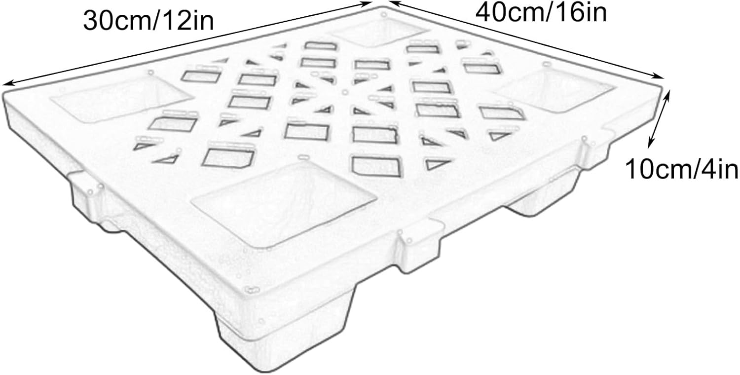 The surface of the pallet uses a hollowing process. This design cleverly maintains air circulation, effectively prevents the goods from getting damp, and builds a safe storage platform for the goods. Moreover, it is easy to clean and can be directly rinsed with water. It can be reused after cleaning.When the moisture-proof pallet is not needed temporarily, it can be stacked for storage. This design can greatly save available space and make the working environment neat and orderly. It is especially suitable for warehouses, workshops and other places with limited space.The edge of the light pallet is equipped with a dedicated buckle to achieve an interlocking function. When a larger area of usable space is needed, the buckle interlocking can easily meet the needs, and the operation is convenient and simple, without the need for complex tools or professional skills.color: blueMaterial: Plasticcharacteristic: Waterproof, wear-resistant, moisture-proof, Heat and cold resistanceSize: 16x12x4 inchesPackage: plastic pallets×1Notice:Please choose the size that suits you