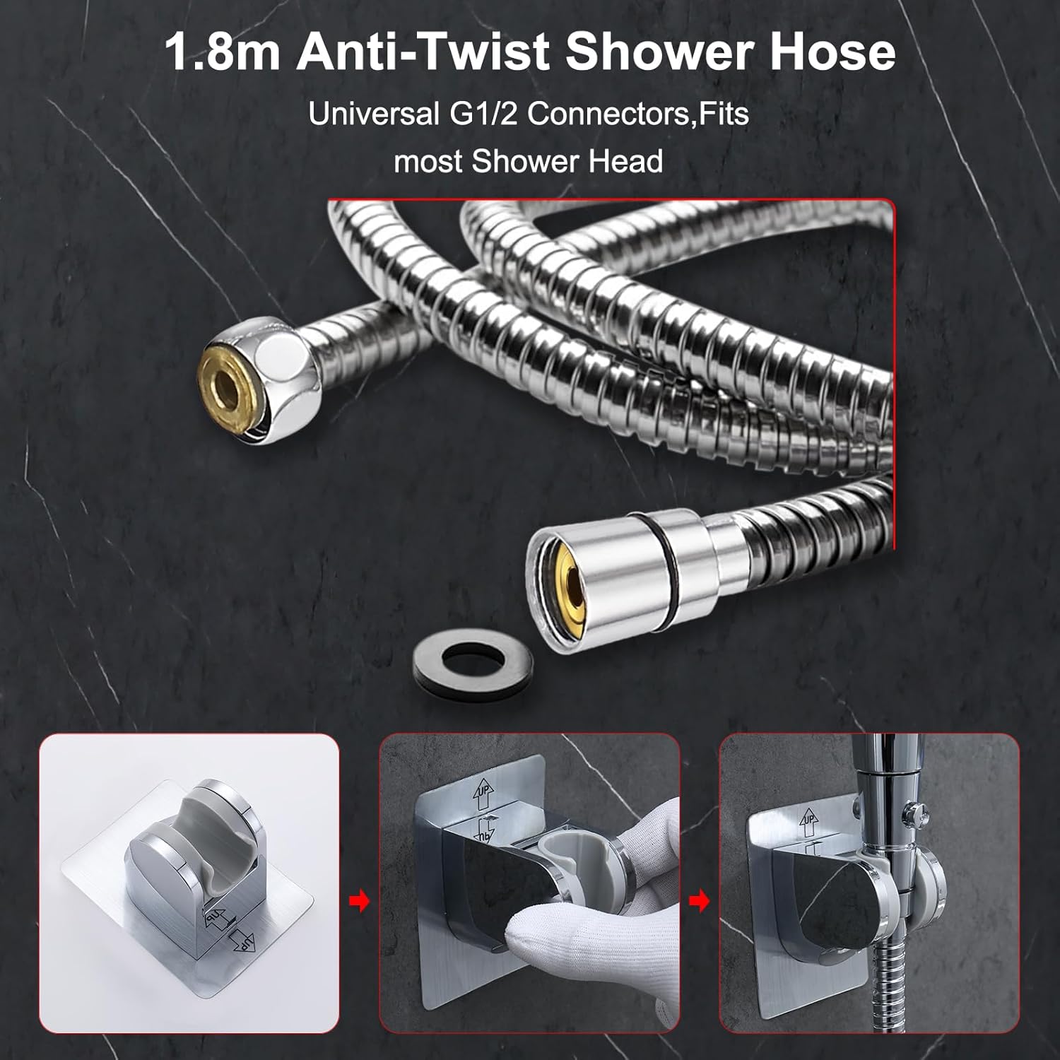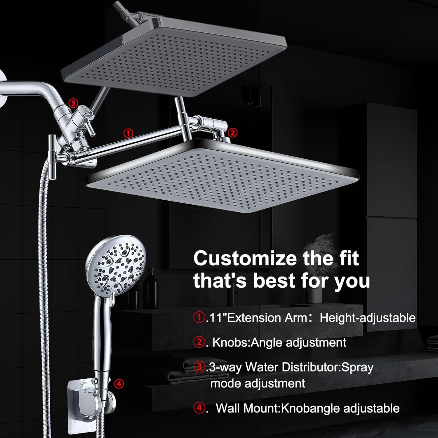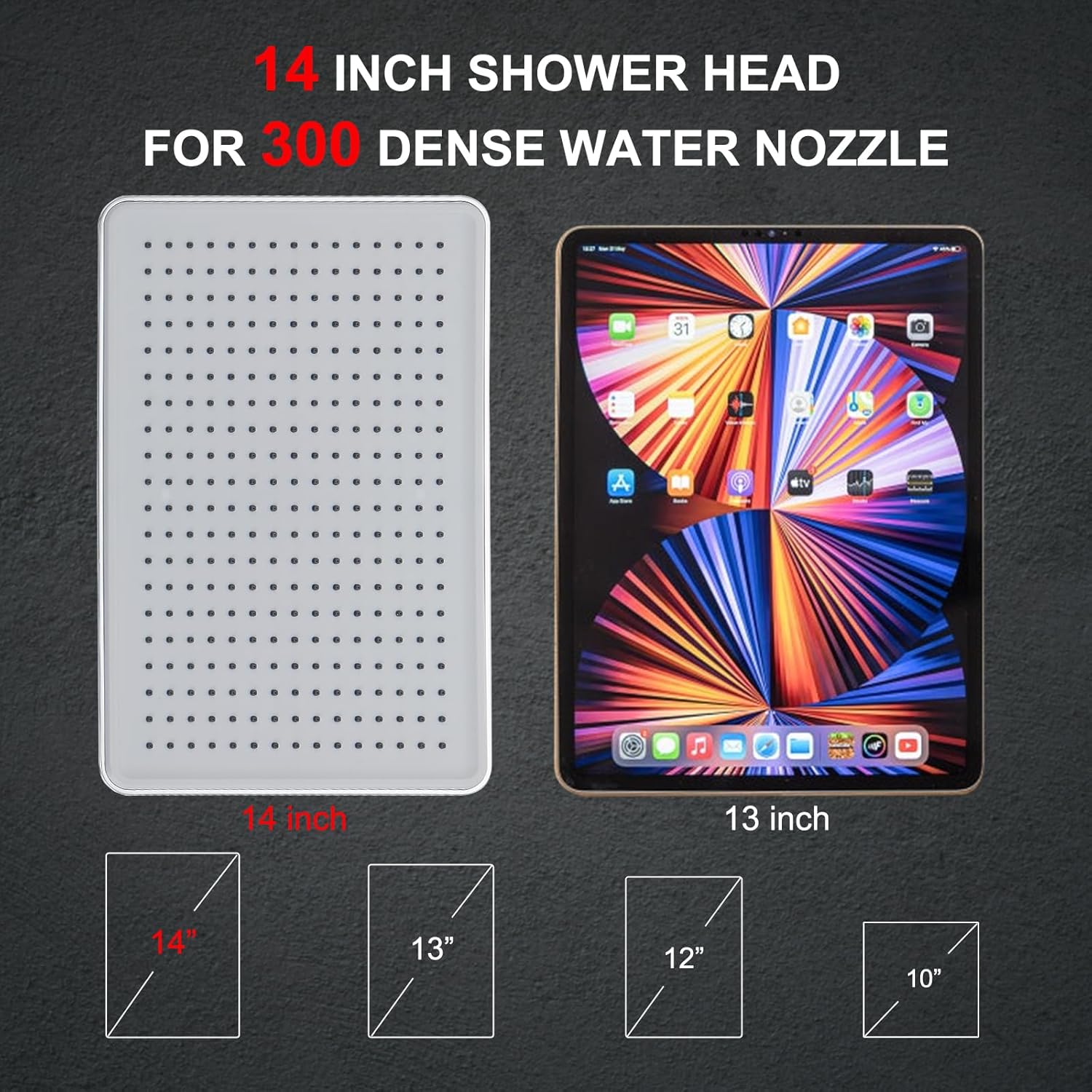 | Included Components | Package Include 1 × 14'' Rainfall Shower Head 1 × 8 Modes Handheld Shower 1 × Extension Arm 1 × 6ft/70”tainless Steel Hose 1 × 3 Way Diverter 1 × Adhesive Shower Bracket 1 × Teflon Tape 6 × Washers 1 × Installation Manual |
