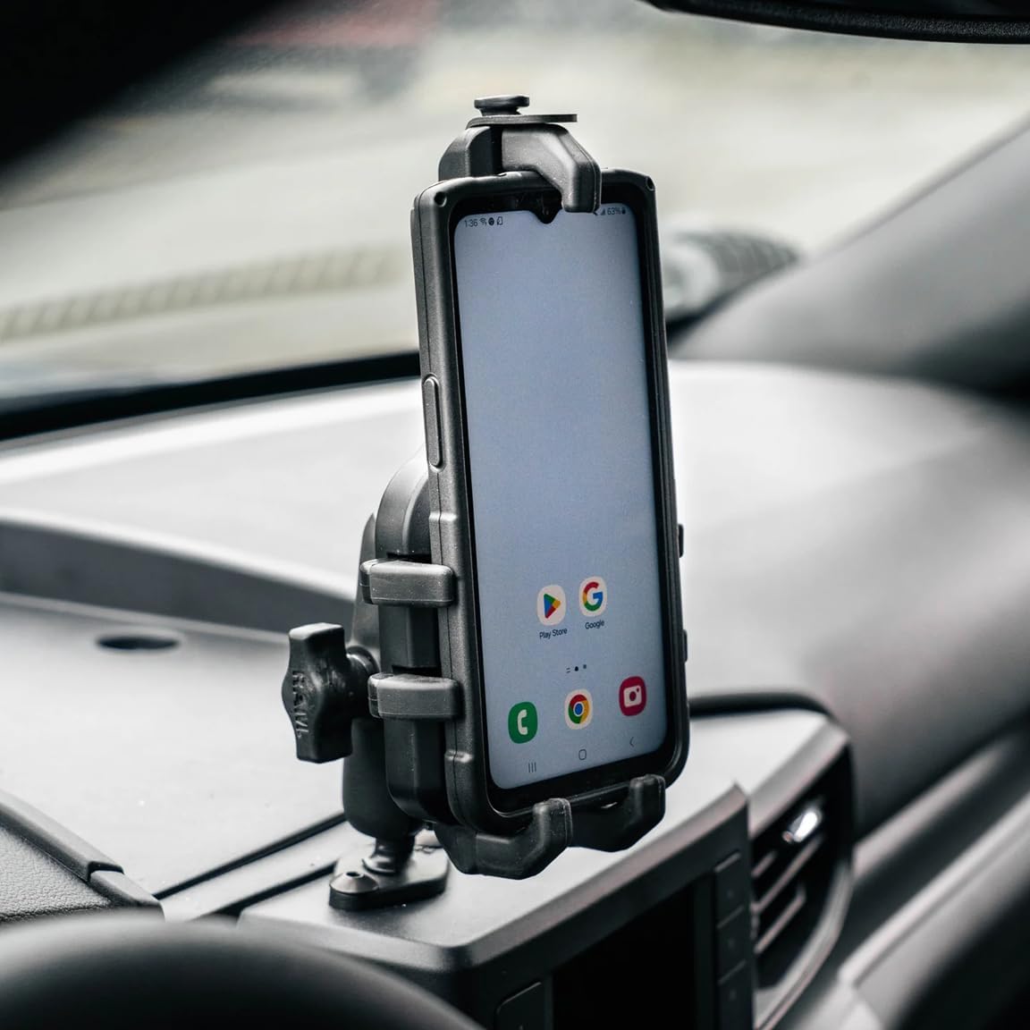 RAM Quick-Grip Pro Phone Holder boasts a spring-loaded cradle with adjustable, rubberized side supports, ensuring a secure grip for diverse phone models. Effortlessly insert or remove your device with a single hand. Its central cavity accommodates Apple MagSafe pucks, complete with a non-slip cover and adhesive. An optional device tether is included for open cockpit settings. Crafted from robust, high-strength composite for enduring performance, even in harsh conditions. Backed by a lifetime warranty for added peace of mind.