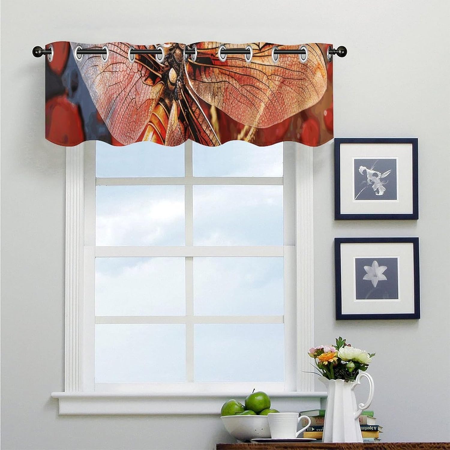 Introducing our 2-piece Red Dragonfly Curtain Valance, a wonderful blend of functionality and elegance to elevate your window decor. Measuring 52 x 18.1 inches per piece, this Red Dragonfly curtain set fits most windows, making it a versatile choice for any room. Crafted from premium curtain fabric, it combines soft touch with long-lasting durability, bringing comfort and practicality to your space. This Red Dragonfly modern curtain features an elegant appearance and smooth texture, adding sophistication to your windows. As a light filtering curtain, it gently softens sunlight while providing moderate privacy, creating a warm glow—ideal for spaces wanting natural light without harsh glare. It also boasts impressive light-blocking performance, insulating your room from heat, protecting furniture and floors from UV damage, and creating a comfortable environment for better sleep. Designed for convenience, each Red Dragonfly curtain has a 4.5cm curtain hole for easy installation on most rods. The washable fabric maintains its shape and softness after multiple washes, with nice drape to keep it neat. Whether you need a kitchen curtain, cafe curtain for a cozy nook, or tier curtain for layered decor, this Red Dragonfly set fits well. Versatile and stylish, this Red Dragonfly set works seamlessly as Valances or Curtain Valance, complementing various decor styles. It can also be used as a printed curtain to add a subtle decorative touch to your living room, bedroom, kitchen, or other spaces. Suitable for most windows, this Red Dragonfly modern curtain is a practical that combines functionality with timeless style. Upgrade your window treatments with our 2-piece Red Dragonfly Curtain Valance set—where quality, style, and functionality meet.