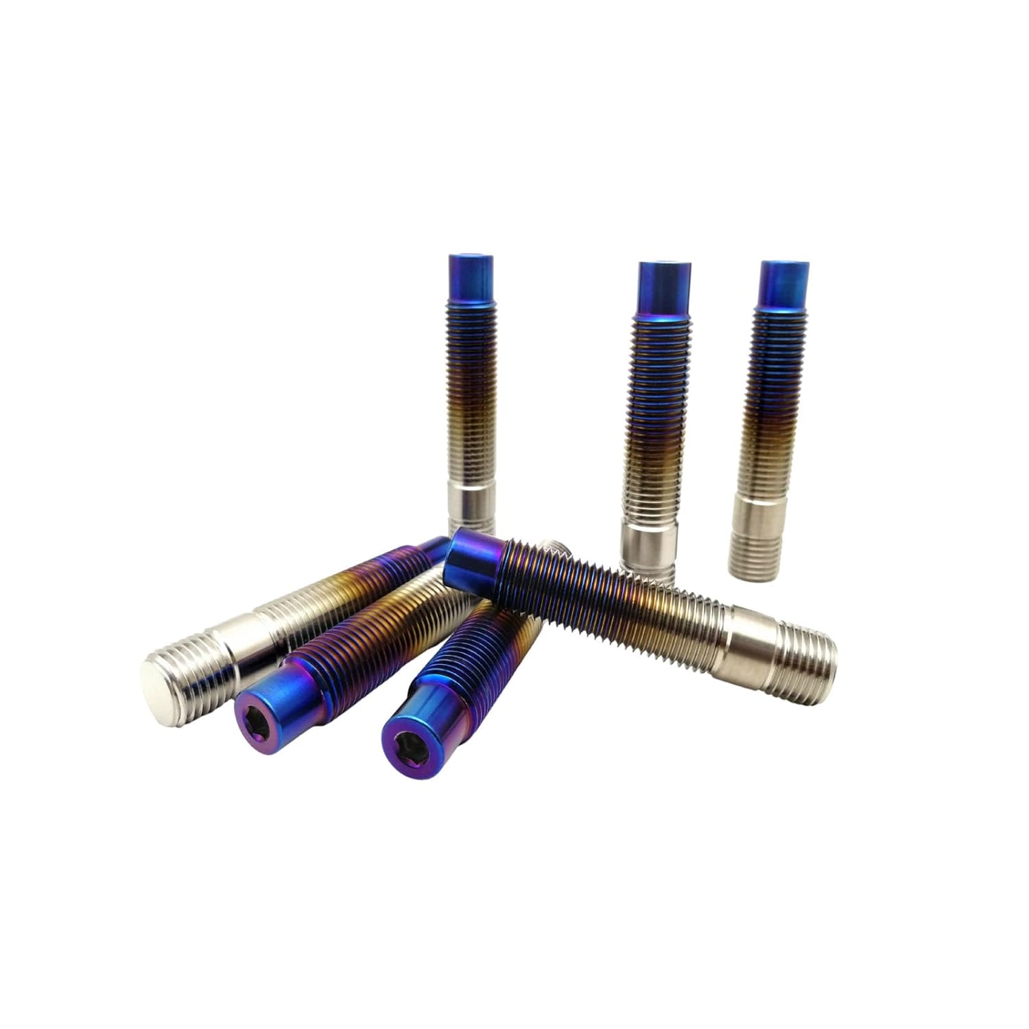 Product Description:RISON-Titanium has been focusing on titanium products for ten years.Stud bolt thread. M12x1.5 to M14x1.5×52mmTotal length of stud bolt:52mmWeight per bolt: 23g Surface finish;Material: aircraft grade titanium alloy ASTM B348 Ti-6Al-4V Gr5;Density: 4.47g/cm3Yield Strength: 890MPa(129KSI)Tensile strength: 970MPa(141KSI)Shear strength: 560MPa(81KSI)Wheel studs are critical to keeping the wheels attached to the vehicle. Wheel studs are a much safer option than wheel studs. Install a set of quality wheel studs and some lug nuts to ensure your vehicle runs safely.One of the troubles with installing wheels directly on the hub is that it can be difficult to align the wheels with the bolt holes. As the wheel gets larger, it becomes more difficult because it gets heavier and heavier. To make it easier to swap wheels, stud conversions are a great way to make this process easier. Also, you can use these studs to install spacers up to 15mm.These titanium forged stud conversion kits will provide a lightweight and durable replacement for your stock studs.The 6AL4V aircraft grade titanium wheel studs, which can be used with nuts, are suitable for Porsche and any other wheel application using M12x1.5 to M14x1.5×52mm, including Lamborghini and many other applications.The studs have an overall length of 52 mm and fit nuts with 2 seat types: original ball seats for Porsche wheels and tapered seats for most aftermarket wheels (please check if your wheels require ball or tapered seats and order accordingly). Rolled threads provide maximum strength and fatigue resistance.Note: When using titanium studs with titanium nuts, be sure to use the proper titanium anti-seize on the threads and hand tighten to correct specifications to prevent wear or seizure.