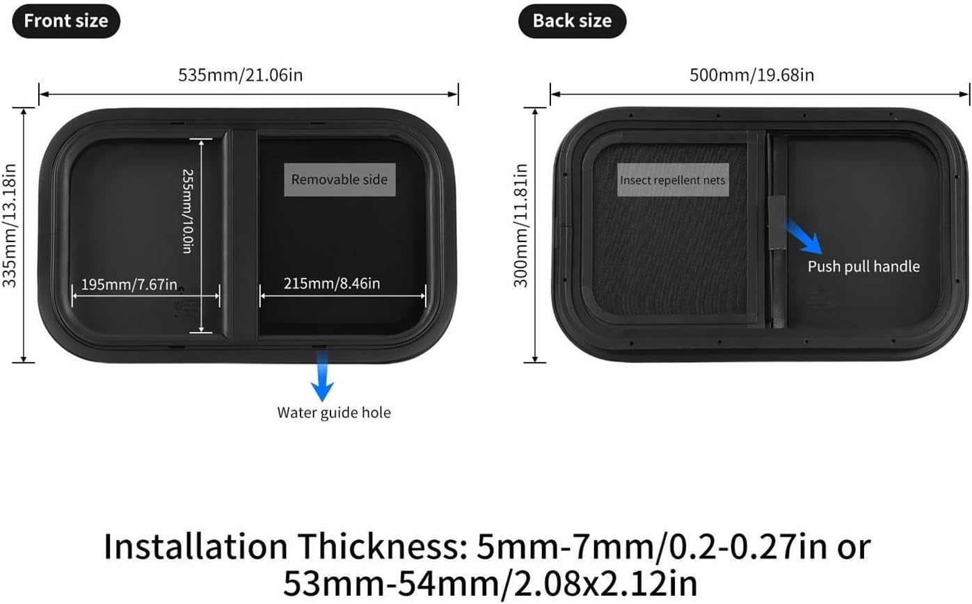 RV Push Pull Window Rounded Corner Sealed Proof Smooth Polished Camper Engineering Vehicle Feature:1. Push Pull : Rounded corner with sliding opening, making your cool in the summer and warm in the winter, providing a comfortable interior environment.2. : of the window has a rubber to ensure a complete seal and , and there is a drainage hole under to ensure the of rainwater.3. Strong Strength: Push pull window frame is made of high strength aluminum alloy and glass, which is strong and safe, effectively resist , sound and heat.4. Smooth Polished: The exterior of the window frame is polished smooth with a black powder coating to provide a good touch and resist oxidation, even in outdoor environments.5. Application: Window can be in storage compartments, living rooms, lounges or wherever are needed, and to enhance interior lighting or ventilation.Specification:Item Type:RVPushPullWindowMaterial: Aluminum alloy, rubber, ABS,tempered glassWindow Shape Size: Approx: 535x335mm/21.06x13.18inInstallation Thickness: Approx: 5mm-7mm/0.2-0.27in or 53mm-54mm/2.08-2.12in sheet metal installation (there will be 2mm error glue fixation)Installation Opening Hole Size: Approx: 500x300mm/19.68x11.81in, vertical or horizontal installationApplication:protectyourprivacyand ensure adequate sunlight does not heat the interior of your RV. Fully sealedkeep your cold in the summer and warm in the winterApplication: Suitable forcamper, RV, engineering car and other any need forwindowsPackage List:1 xPushPullWindow1 xFixed Frame1 x Package of Guide Hole Plug (Random Number)1 x Package of Fixed Screw (Random Number)Note:1. Please allow slight error due to manual measurement. Thanks your understanding.2. Monitors are not calibrated same, item color displayed in photos may be showing slightly different from the real object. Please take the real as standard. ==========Hign-concerned : NoneSpecial Features : RV Push Pull WindowItem Weight : 3466gModel Name : Camper Push WindowMaterial : Aluminum alloy, rubber, ABS, tempered glassWindow Shape Size : Approx: 535x335mmItem Type : RV Push Pull Window1 : RV Push Pull Window2 : RV Camper Windows3 : Camper Window4 : RV Rounded Corner Window5 : Camper Push Window6 : RV External Push Window