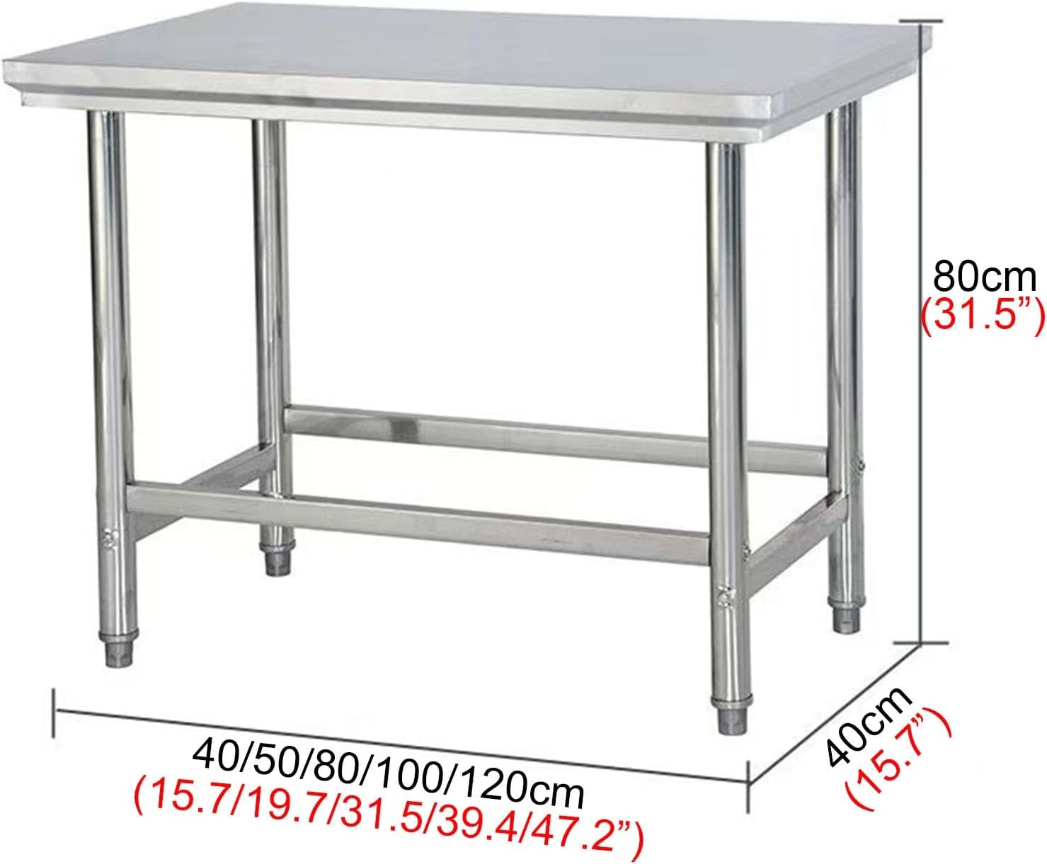 Product Name: Stainless Steel WorkbenchProduct Features: Sturdy and Wear-ResistantProduct Dimensions:40x40x80cm/15.7x15.7x31.5”, 50x40x80cm/19.7x15.7x31.5”, 70x40x80cm/27.6x15.7x31.5”, 80x40x80cm/31.5x15.7x31.5”, 100x40x80cm/39.4x15.7x31.5”, 120x40x80cm/43.3x15.7x31.5”, 50x50x80cm/19.7x19.7x31.5”, 70x50x80cm/27.6x19.7x31.5”, 80x50x80cm/31.5x19.7x31.5”, 90x50x80cm/35.4x19.7x31.5”, 100x50x80cm/39.4x19.7x31.5”, 110x50x80cm/43.3x19.7x31.5”, 120x50x80cm/47.2x19.7x31.5”, 60x60x80cm/23.6x23.6x31.5”, 70x60x80cm/27.6x23.6x31.5”, 90x60x80cm/35.4x23.6x31.5”, 100x60x80cm/39.4x23.6x31.5”, 110x60x80cm/43.3x23.6x31.5”, 120x60x80cm/47.2x23.6x31.5”, 70x70x80cm/27.6x27.6x31.5”, 100x70x80cm/39.4x27.6x31.5”, 120x70x80cm/47.2x27.6x31.5”, 100x80x80cm/39.4x31.5x31.5”, 80x80x80cm/31.5x31.5x31.5”, 120x80x80cm/47.2x31.5x31.5”Product Material: Stainless SteelUsage Environments: Snack shops, barbecue stalls, outdoor camping, home useFour-fold edge design with thoughtful edge wrapping prevents hand cutsRotating height adjustment at table corners; swiveling feet easily level uneven surfacesProduct ListWorkbench x1 + Installation HardwareImportant Notes:Stainless steel products may exhibit slight welding marks due to manufacturing processes.Minor scratches may be present on stainless steel components.All dimensions are manually measured and may have slight variations.Images may show slight color differences due to shooting angles and lighting variations.
