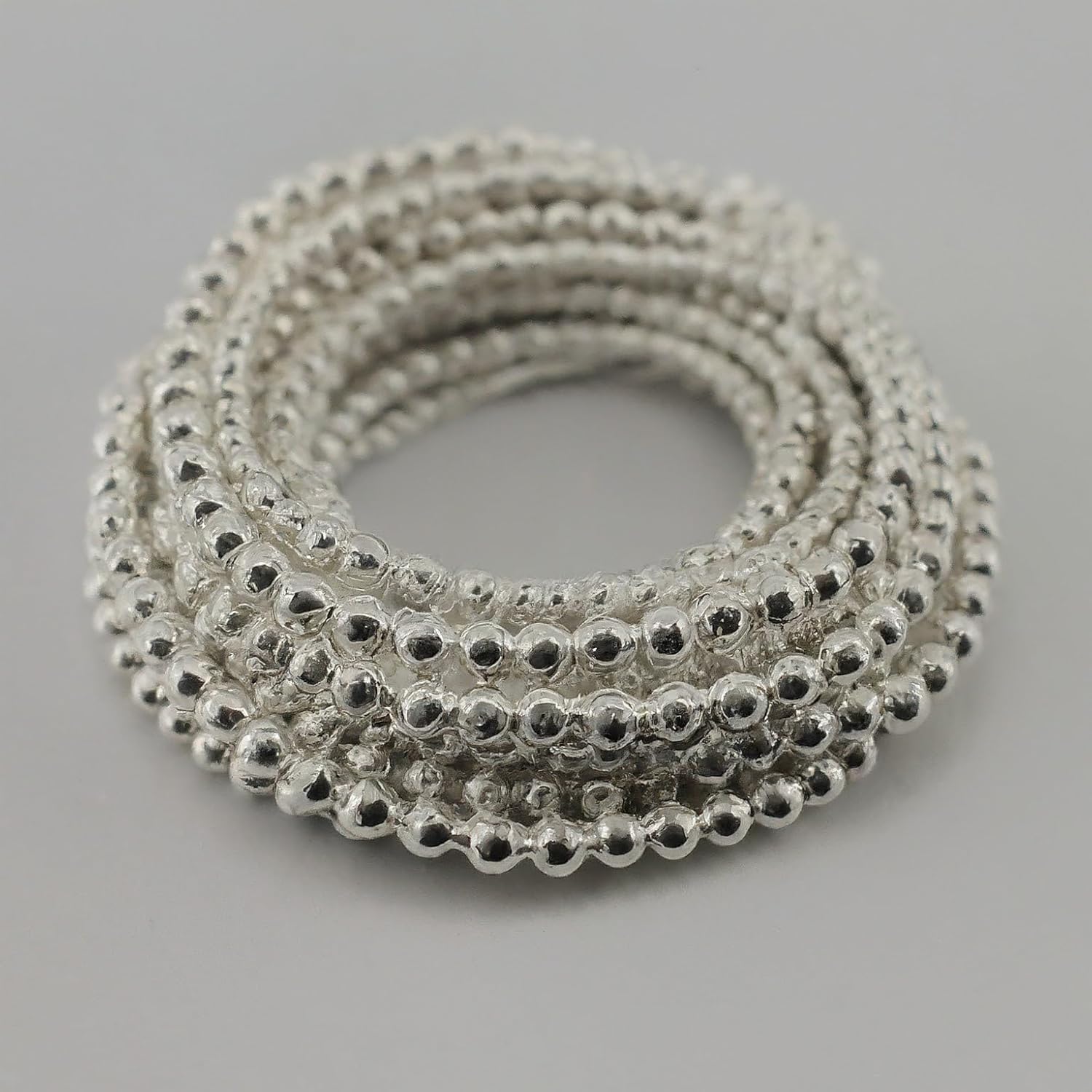 This dead-soft, sterling silver full-bead wire offers a rugged beaded appearance and is able to withstand more metal forming tasks. The rugged look is created by the beads themselves varying from fully rounded to slightly flattened or somewhat squared-off. The slenderness of the wire between beads makes this wire suitable only for applications that do not subject the wire to ongoing stress; we suggest annealing this bead wire frequently. Dead soft wire is easy to bend, and can be shaped, looped, or braided with ease. This full-bead wire is not hardened, making it easier to manipulate, but it is not suitable for hardening or hammering. It will maintain its shape well when bent. This particular bead wire is tarnish resistant, but we recommend finishing all wire components to preserve the shine.