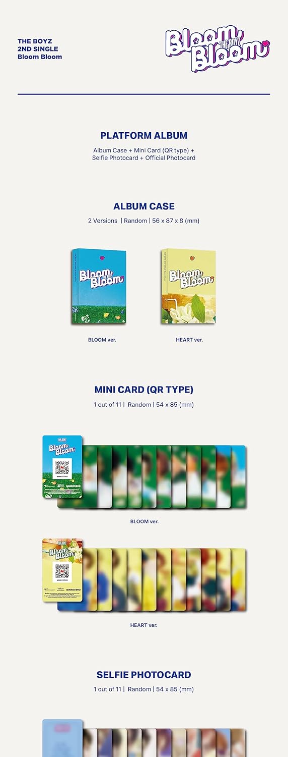 THE BOYZ Bloom Bloom 2nd Single Album Platform VersionRelease Date - 16th June 2023-Platform Version- Case+1p QR Type Mini Card+1p Selfie Photo Card +11p Official Photo Card+Free Tracking Number.Depending on versions , contents inside the album may differ.Platform Version is not included CD, only has digital contents.Track List 01. Bloom Bloom - Title 02. Butterfly (몽중) 03. Clover✔Officially distributed Brand New & Original item from Manufacturer. ✔All items from original manufacturers are delivered in original sealed package condition. ✔Your purchase quantity will be count on Korea HANTEO & GAON Chart! ✔All ordered item will be shipped with a tracking number. ✔All products are packed and shipped in box.
