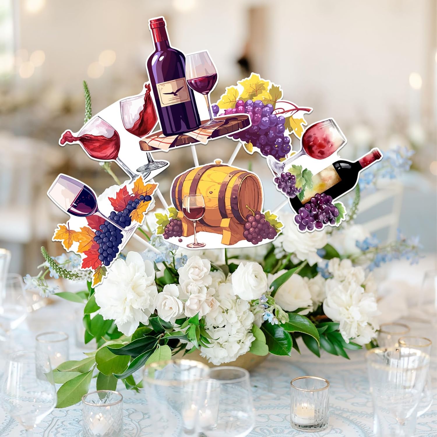 Wine Tasting Party Decorations Component: 24pcs table centerpieces, 4pcs of each type, approx 6×7 inches. Made of card stock, double-sided printing, you can use these red wine table centerpieces as your wine tasting themed party table decoration. You just need to simply select centerpieces and then glue them to paper sticks then you will get unique red wine theme party supplies.