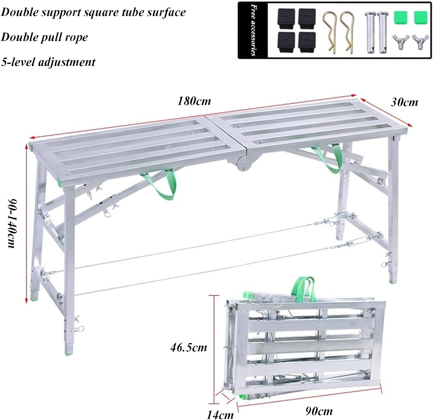 Adjustable Scaffolding Platform – Portable, Foldable & Durable Workspace SolutionElevate your construction and repair projects with the Adjustable Scaffolding Platform, the ultimate all-in-one equipment set designed for versatility, mobility, and safety. Crafted from lightweight yet heavy-duty metal frames, this scaffolding platform combines foldable convenience with adjustable height settings, making it ideal for generic de construccion tasks, indoor renovations, or outdoor repairs.Wide Range of Applications: The adjustable work platform is widely used in various industries and projects. From construction sites to home renovations, which can be used for wall painting, window cleaning, unload, home decorating, etc., it provides a trusted and safe platform for workers to perform their tasks effectively.Make your father or husband happier with a special gift! Give them some sturdy and practical tools to make their work easier and more enjoyable.【Important Safety Instructions】1. When using the portable scaffolding, please pay attention to safety. The legs of the bench shuould be placed firmly on the ground with both legs straight open to stabilize it. 2. Staircase Use: When using on stairs, place two legs on the ground and the other two securely on steps. Stair height differences may prevent full platform coverage—ensure stability before use to avoid tipping or slipping. 3. Handling & Maintenance: Made of welded iron, this scaffolding may have sharp points—wear gloves during setup. Always secure the platform before climbing, use caution, and inspect regularly to ensure safe operation.