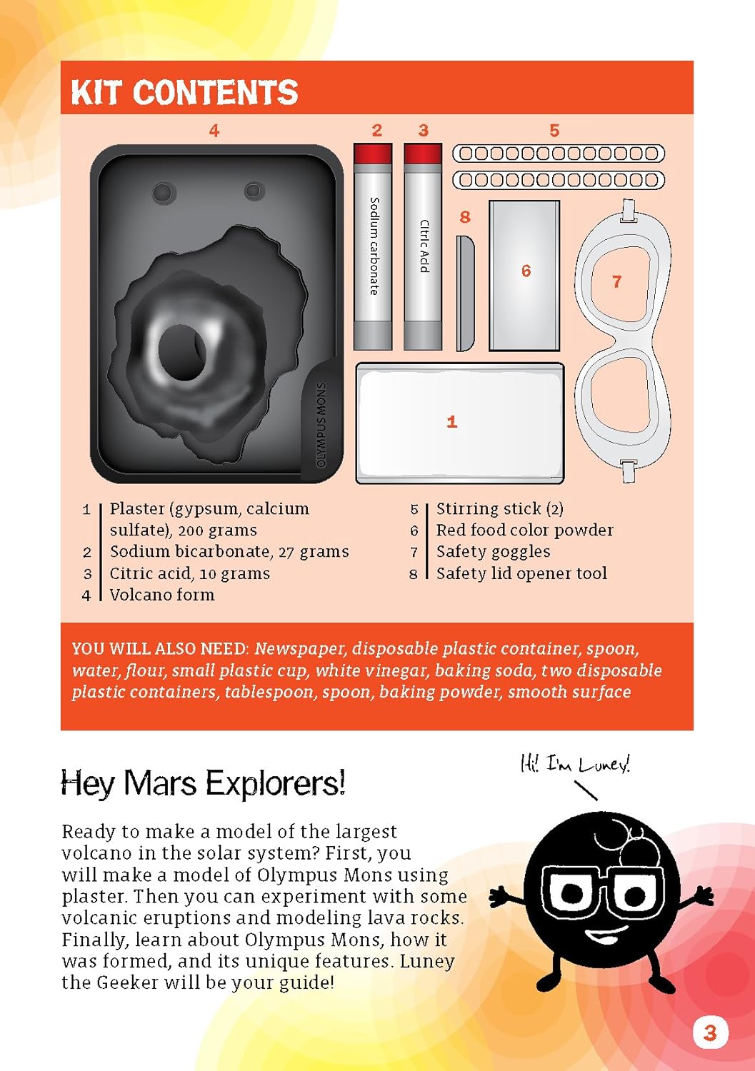 Erupt a model of the largest volcano in our solar system, Olympus Mons on Mars. It is three times taller than Mt. Everest. Using a special plaster mixture and iron oxide powder, your mega-volcano hardens after each eruption and slowly grows like a real volcano.